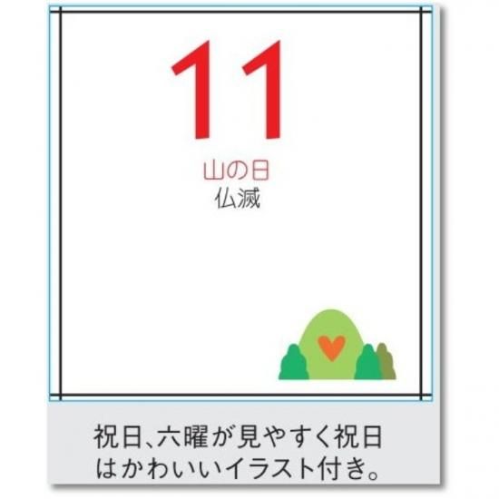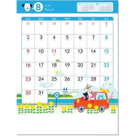 動物たちの表情に思わず元気がわいてきそうです。大きな文字を中心にした実用的なカレンダーに、境目朋子さんのかわいいイラストをプラス。楽しさと実用性、両方の魅力を兼ね備え、幅広い年齢層の方にお使いいただけます。