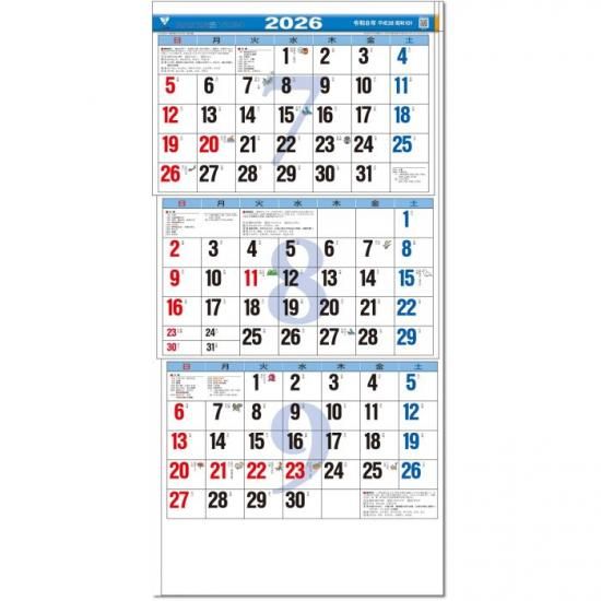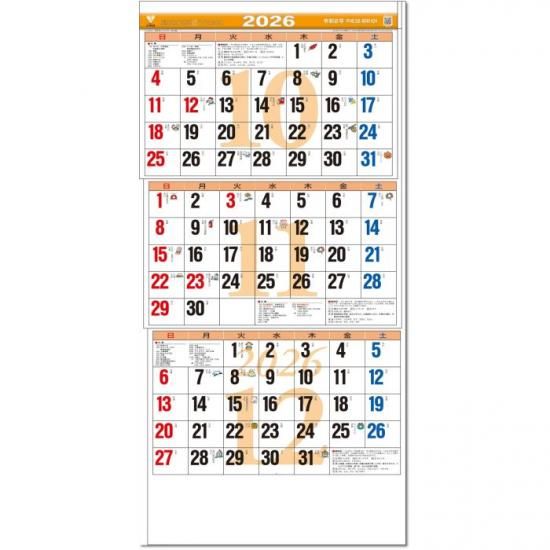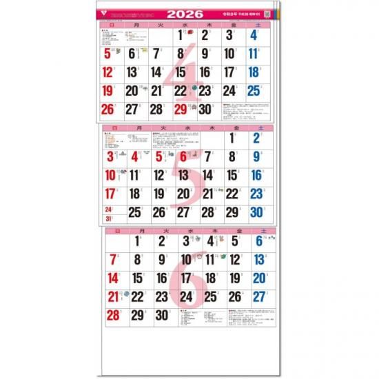 TD30796 カレンダー 2026 壁掛け カラー3ヶ月文字月表-上から順タイプ-